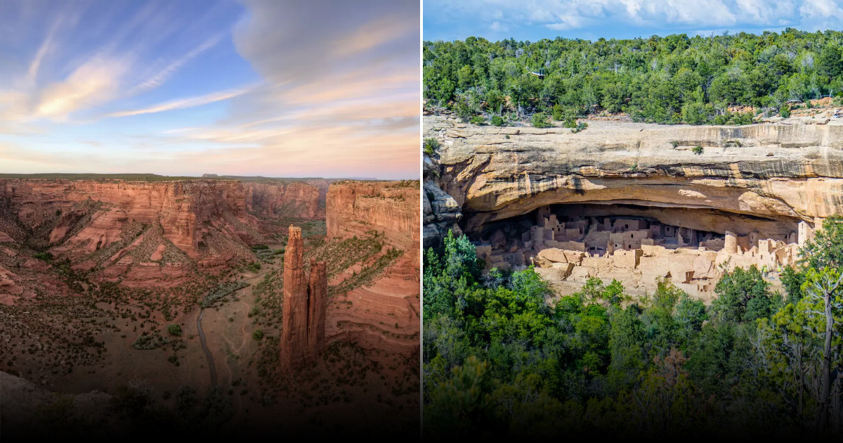 W ramach Płaskowyżu Czterech Rogów (Four Corners) Park Narodowy Mesa Verde przechowuje ślady życia Pueblo, którzy budowali mieszkalne klify między VI a XIII wiekiem naszej ery. Znajduje się tu ponad pięć tysięcy stanowisk archeologicznych i osad w pionowych skałach, niczym wyspy na niebie nad krajobrazem. Dla turystów dostępne są Cliff Palace – największe i najlepiej zachowane mieszkanie w klifie, a także Balcony House, do których prowadzą drewniane schody i tunele, odsłaniające kiwy (podziemne pomieszczenia ceremonialne) i bogatą kulturę przetrwania w surowych warunkach.